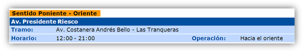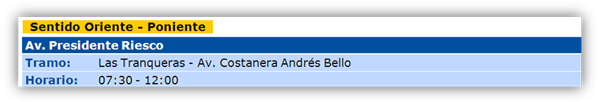 - Avenida Presidente Riesco, tiene variabilidad en su sentido de transito en determinados periodos del día para favorecer el desplazamiento de los vehículos que circulan por esta avenida. Las vías reversibles funcionan de lunes a viernes, exceptuando los días festivos.
