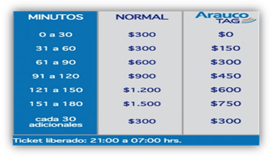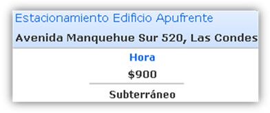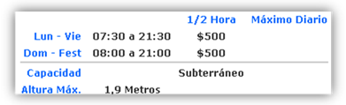 - Los valores para cada usuario tienen un valor de $500 cada ½ Hora, máximo diario $8.000, pudiendo estacionar por Avenida Presidente Riesco 5330. Los estacionamientos tienen una capacidad de 700 vehículos en 3 niveles, funcionamiento de lunes a domingo.